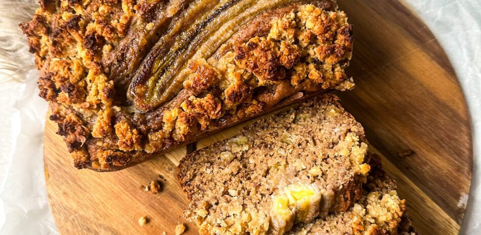 Drücke dann eine halbe Banane oben in den Teig und vermische danach die Zutaten für die Streusel und streue diese ebenfalls darüber.